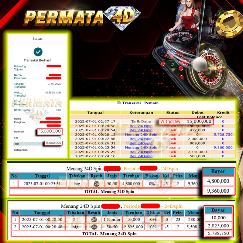 Selamat kepada User id : CI**** Telah berhasil mendapatkan kemenangan besar pada permainan SWEET BONANZA 1000 kemenangan Sebesar Rp. 200.000.000, Setelah mengisi formulir withdraw dengan kurung waktu hanya 5 - 10 menit pihak Permata4D sudah melakukan transfer kepada pemilik Userid dan dana sudah dapat di cairkan oleh pemenang. Bukti pembayaran yang kami berikan merupakan bukti pembayaran yang SAH / VALID yang langung di dapatkan melaui tanda transfer transaksi dari Bank yang di tuju.